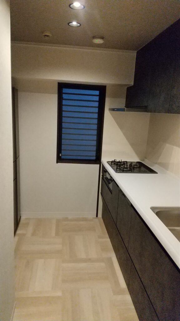 キッチンの壁と床をリフォーム。掃除しやすい素材を使用しました。